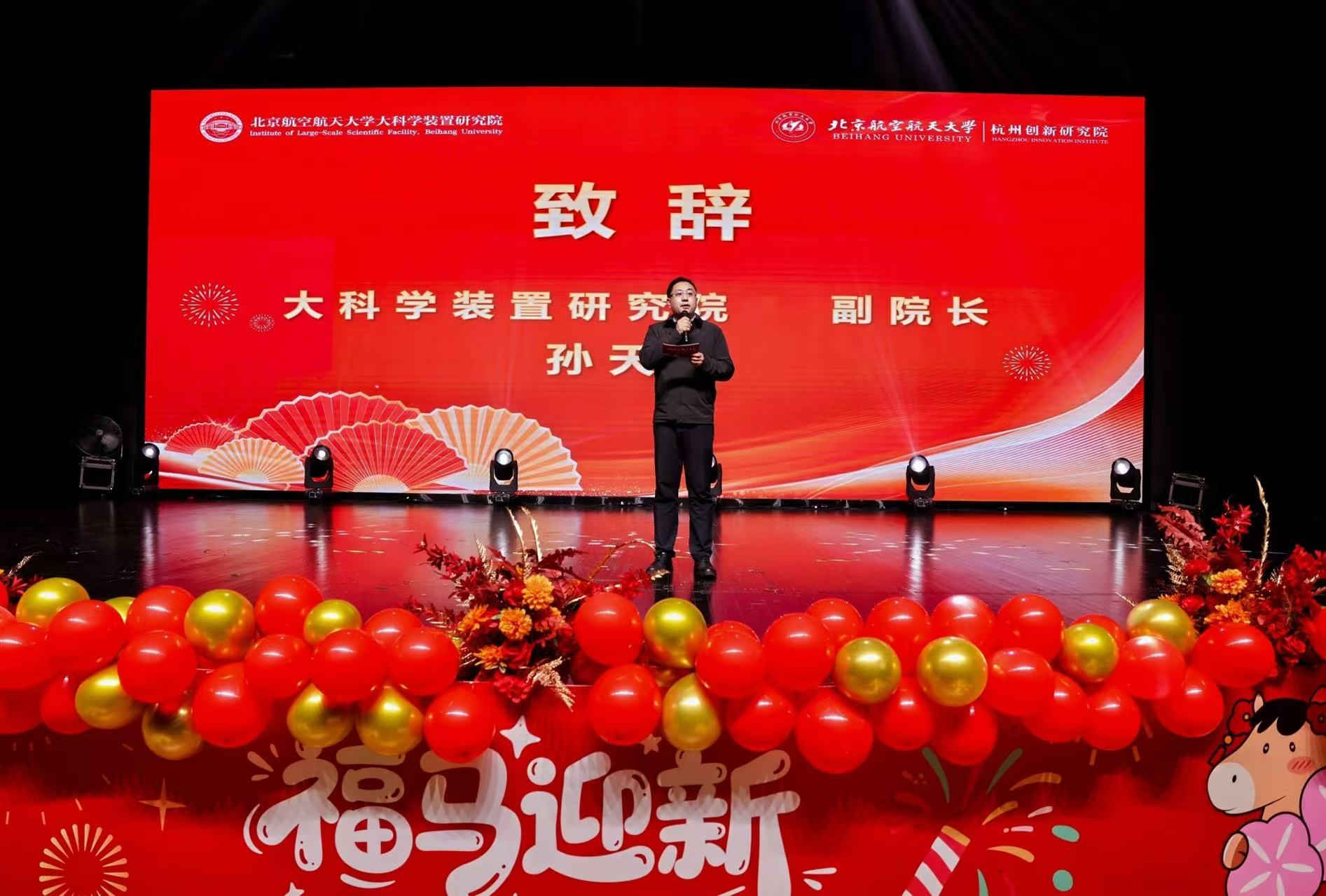 晚会伊始,北航大科学装置研究院副院长孙天旭致辞。他向全体师生致以新年问候,对大家一年来在科研攻关与人才培养中的重要成果表示肯定,并寄语同学们在新的一年里坚定目标、脚踏实地,在潜心科研与全面发展中不断提升自我,在更广阔的舞台上书写属于自己的青春篇章。